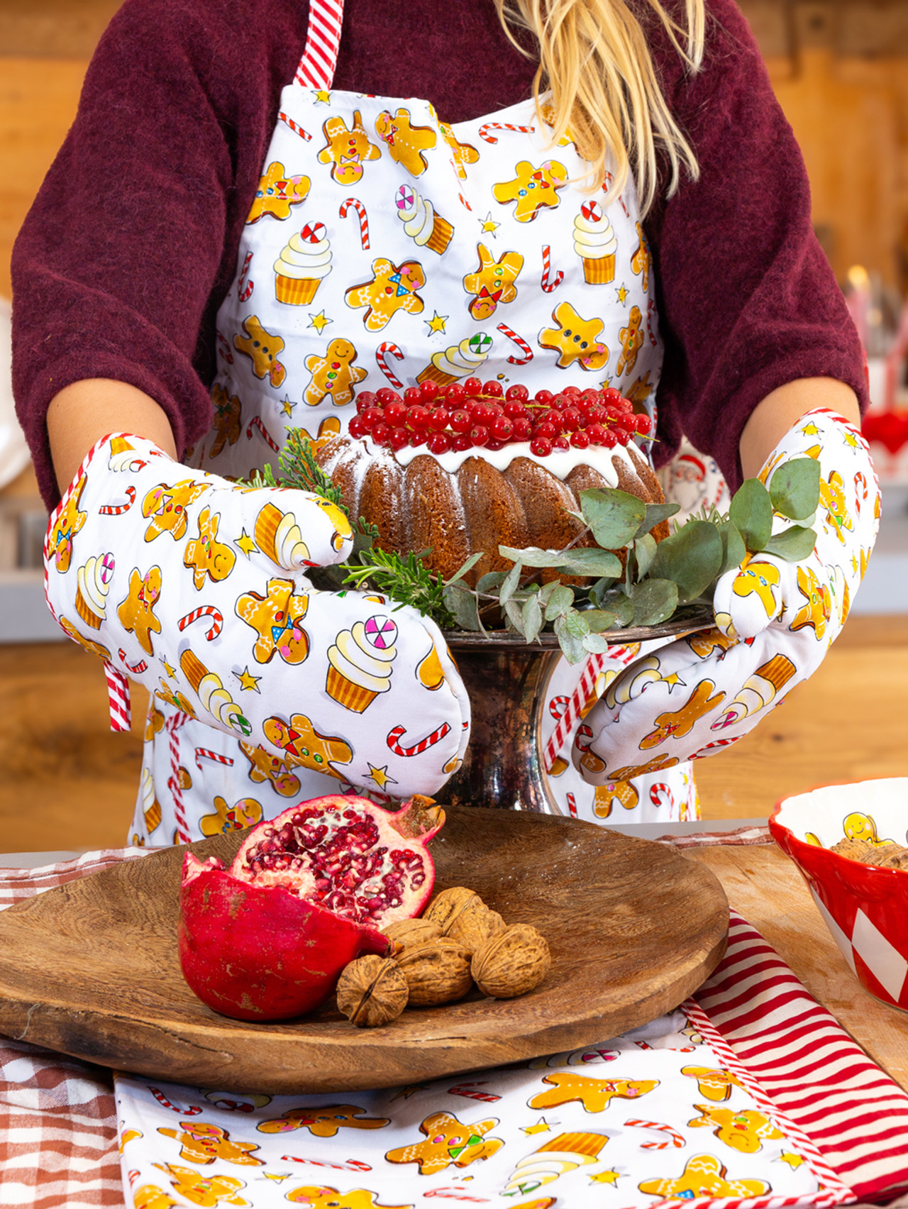 Zet je kerstbaksel warm uit de oven en je Blond ovenwant aan. Deze 100% katoenen ovenwant is niet alleen praktisch maar ook een feestelijke eyecatcher in je keuken. De vrolijke illustraties van gingerbread mannetjes, cupcakes en candy canes brengen je meteen in decembermodus. De want heeft een zachte voering, een handige lus om ‘m op te hangen en een rood-wit gestreepte rand als finishing touch. Combineer hem met de bijpassende theedoek en kerst schort voor een Blond match in je keuken. Of je nu koekjes bakt met je kinderen of een ovenschotel maakt voor een kerstdiner met vrienden, deze ovenwant houdt het warm, letterlijk én qua sfeer. Leuk voor jezelf of als cadeau.